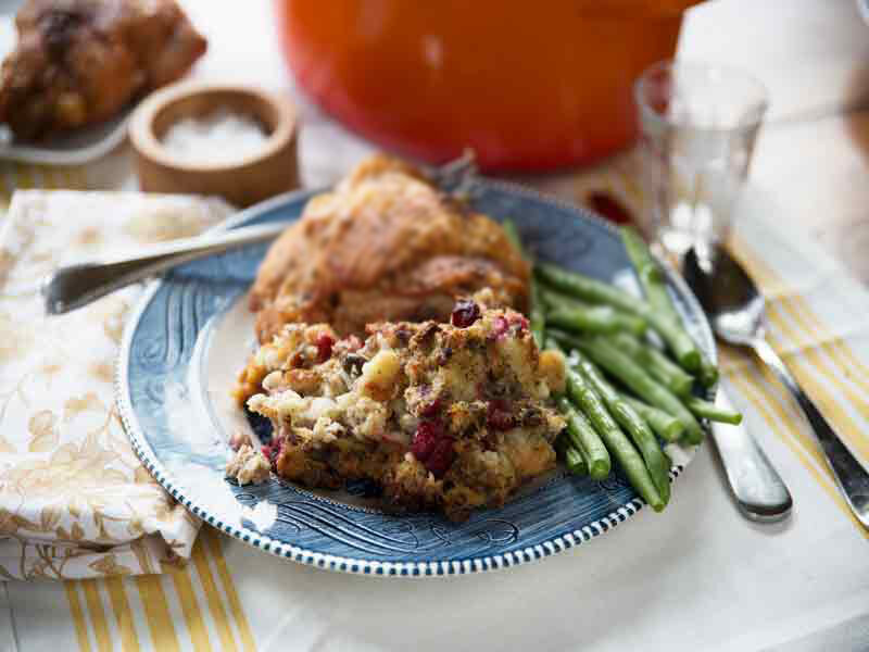 We bought a turkey (with the pop-up thermometer), and I made the side dishes we’d enjoyed with our family for years. My grandma was a great home cook. After spending time with her each summer, I believe she ignited my love for cooking. Her dressing was great. When she was no longer able to make it, my dad started preparing the dressing with the same recipe. It’s almost a bread pudding, using water, stock, eggs and sausage. It was my turn. The recipe wasn’t written down at the time. I followed by dad’s instructions over the phone and it turned out really well- for a newbie.At the end of that meal, and after the table was cleared, the dishes were done and we were all full and comfy,my grandma announced that everything had been delicious, but had one question. Why hadn’t I made a fruit salad? Argh! I had, but had forgotten to take it from the refrigerator to the table. Later that day, Gary, myself, and our friend Don settled in front of the fireplace and ate the entire fruit salad after everyone had left.There are so many places to learn how to roast a turkey. It’s not that difficult. You can do it! I usually brine mine, and used a concoction for basting a found years ago from Martha Stewart. Recently I’ve heard that basting has gone out of style. I still have to baste. It’s part of the day. My sister has uses a roaster, and starts the bird breast side down. It makes the meat very juicy and delicious. And yes, I’ve had a year, perhaps the first, when I left the plastic bag of giblets in the turkey. Haven’t we all? Back to the dressing. It’s dressing because it’s not inside the turkey. That’s stuffing. Our family doesn’t stuff the turkey. Why? I have no idea. We just don’t.As I was working on The Little French Bakery Cookbook, I wanted to share the recipe with others. Over the years, my recipe has changed. I use chicken stock and less water, I also add nuts and dried fruits for texture and flavor.My recipe also uses freshly baked Cardamom White Bread. The recipe makes four loaves so you’ll have plenty dressing and toast, and turkey sandwiches the next day.This year I had the opportunity participate in Jones Dairy Farm’s Stuffing and More recipe collection and used the company’s All Natural Pork Sausage Roll to create a variation on my dressing recipe. What could be better than a little brandy and cranberries? Two Wisconsin traditions baked into Thanksgiving goodness. For another interesting twist, I added pistachio nuts. We really enjoy the taste and texture. Plus, you can nibble on the leftover pistachios while you’re waiting for the turkey and trimmings to bake.