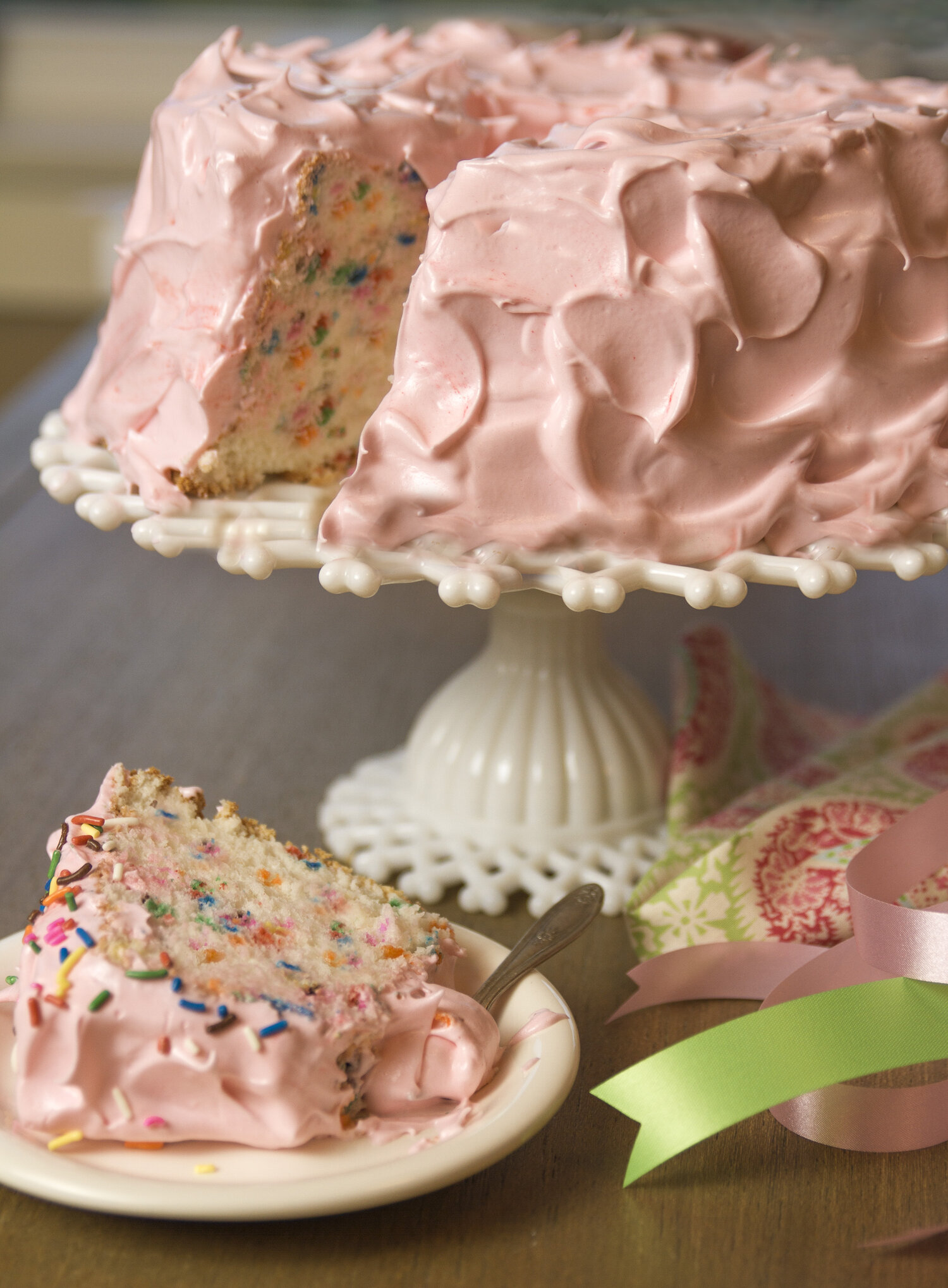 I tossed the sprinkles around in the flour mixture so they’re stay afloat in the batter. I used “jimmy” style sprinkles over the little beads. I’m not sure how the tiny beads would work, but you could give them a try.Click HERE to print the recipeConfetti Angel Food CakeIngredients1 3/4 cups sugar (process 2 minutes to make super fine)1/4 teaspoon salt1 cup cake flour, sifted12 egg whites (room temperature)1/3 cup warm water1 teaspoon vanilla extract1 1/2 teaspoons cream of tartar2-3 Tablespoons sprinklesDirectionsPreheat oven to 350 degrees F.In a food processor process the sugar about 2 minutes until it is superfine. Mix half of the sugar with the salt the cake flour, setting the remaining sugar aside.In a large bowl, combine egg whites, water, extract, and cream of tartar. Using a hand mixer or stand mixer, whip the egg mixture until foamy. Slowly sift the reserved sugar, beating continuously at medium/high speed. Whip until medium peaks form. The egg whites should make peaks that may droop slightly after a few moments.Sprinkle some of the flour mixture in to dust the top of the egg mixture. Using a spatula fold in very gently. Fold in the remaining flour mixture with sprinkles in 2-3 parts, folding well each time.Carefully spoon mixture into an ungreased angel food cake pan. Bake for 35 minutes then test for doneness with a wooden skewer or toothpick. (The skewer should come out dry).Cool upside down on cooling rack for at least an hour before removing from pan. My mom always propped the pan on top of a bottle.